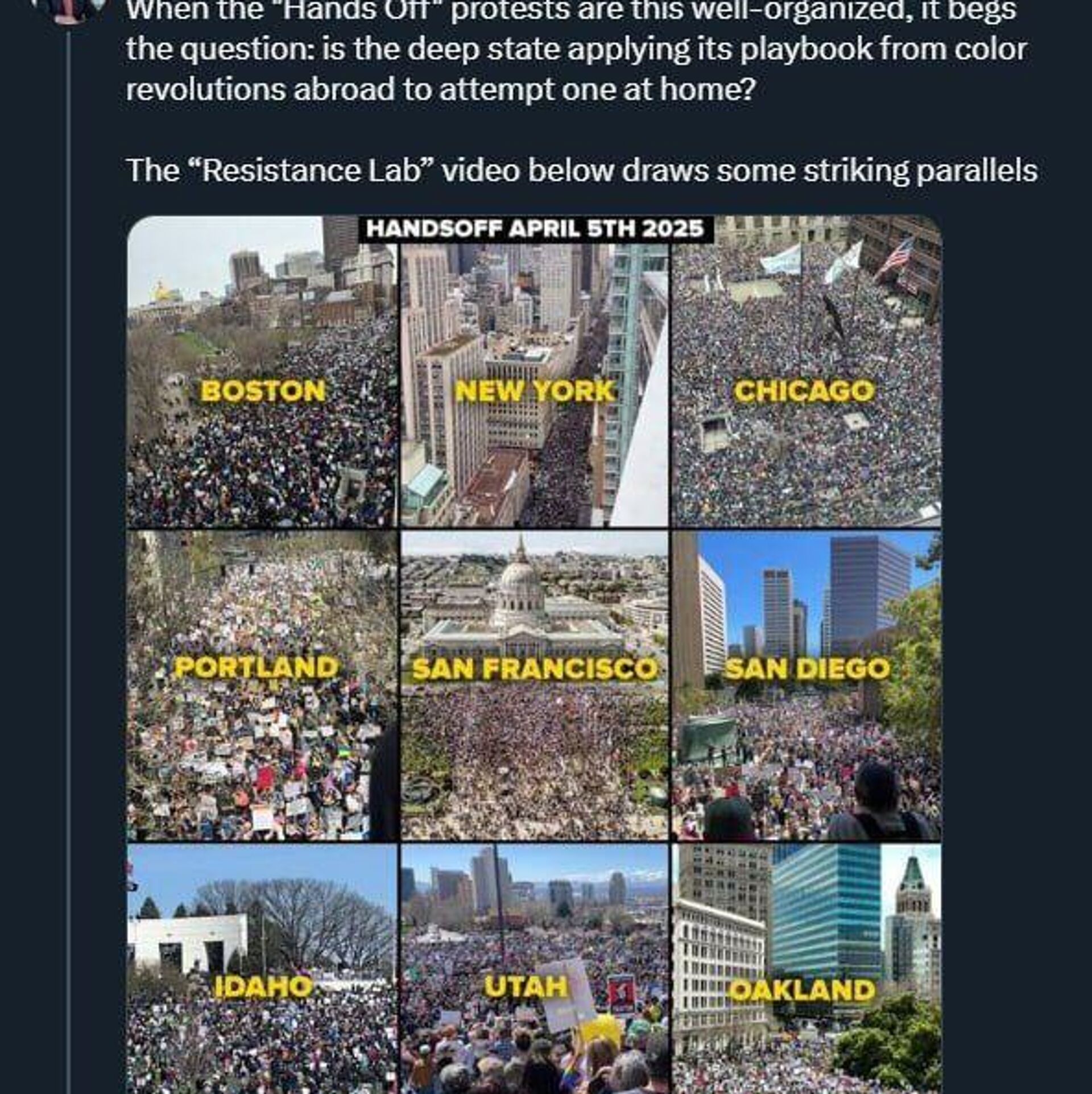 በአሜሪካ እየተደረገ ያለው "ዘ ሃንድስ ኦፍ" ተቃውሞ በደንብ የተደራጀ መሆኑ ዲፕ ስቴት ውጭ ያካሄዳቸውን የቀለም አብዮቶች ሀገር ውስጥ ለመተግበር እየሞከረ ነው ወይ? የሚል ጥያቄ የሚጭር ነው ሲሉ የሩሲ ኢንቨስትመንት እና ኢኮኖሚ ትብብር ልዩ ልዑክ ኪሪል ዲሚትሪዬቭ ተናግረዋል።