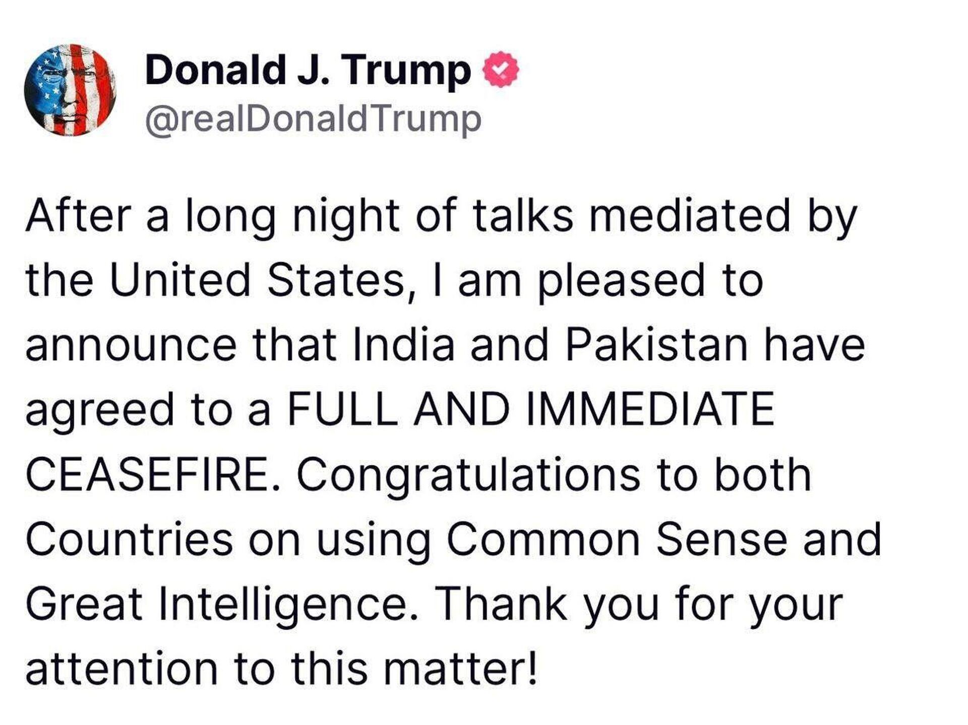 15:14 10.05.2025 (የተሻሻለ: 15:34 10.05.2025) ህንድ እና ፓኪስታን በአሜሪካ አሸማጋይነት የተሟላ እና አስቸኳይ የተኩስ አቁም ለማድረግ መስማማታቸውን ትራምፕ አስታወቁ