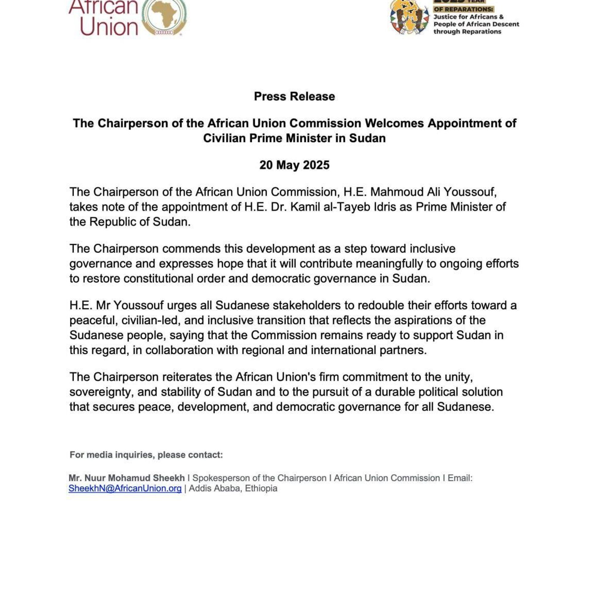 ካሚል ኤልታየብ ኢድሪስ ጠቅላይ ሚኒስትር ሆነው መሾማቸው በሱዳን ዲሞክራሲያዊ ስርዓትን ለመመለስ የሚደረገውን ጥረት ይደግፋል ብለው ተስፋ እንደሚያደርጉ የኮሚሽኑ ሊቀመንበር ማሐሙድ አሊ ዩሱፍ ገልጸዋል።