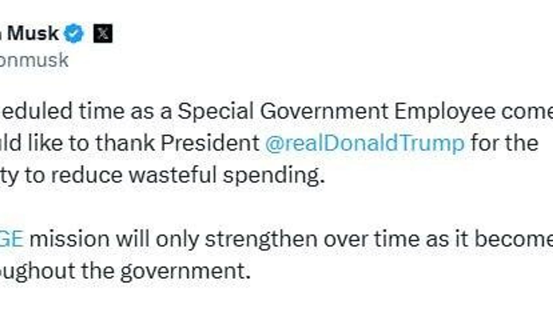 አሜሪካዊው ባለሀብት ልዩ የመንግሥት የሥራ ግዜው እንዳበቃ በመግለፅ፣ ትራምፕ ላደረጉለት ድጋፍ ምስጋናውን በማቅረብ መምሪያው እየጠነከረ ይሄዳል ብሎ እንደሚያምን ተናግሯል።