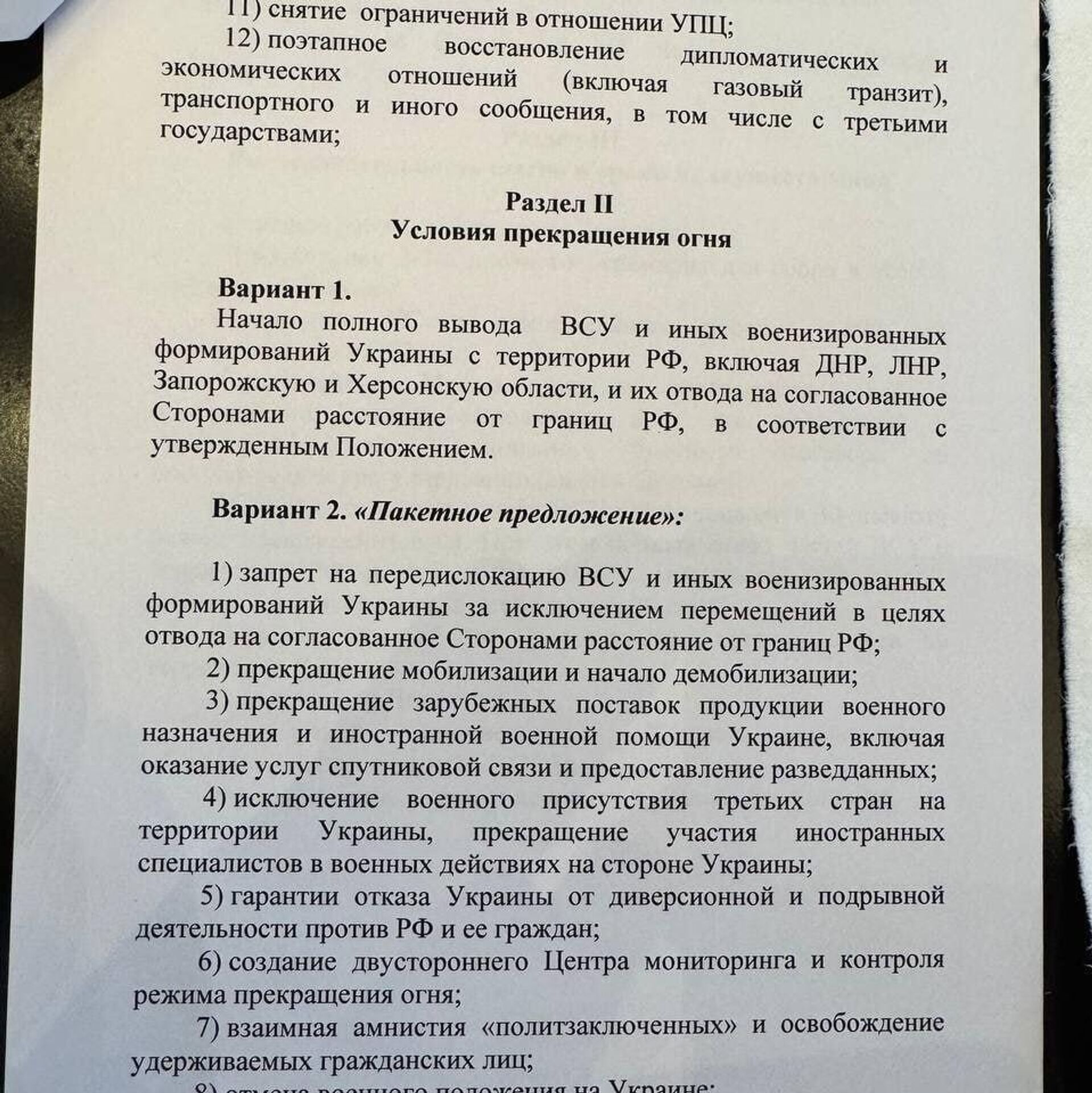 ▪ ሁለተኛው አማራጭ የወታደሮች ስምሪትን ማስቆም፣ ምልመላ እና ለኪዬቭ የሚደረገውን የውጭ ወታደራዊ ዕርዳታ ማቆም፣ ወታደሮችን መበተን እና የሶስተኛ ሀገራት ወታደራዊ ተሳትፎን ማስቀረት የተመለከቱ አንቀጾችን ያካትታል።