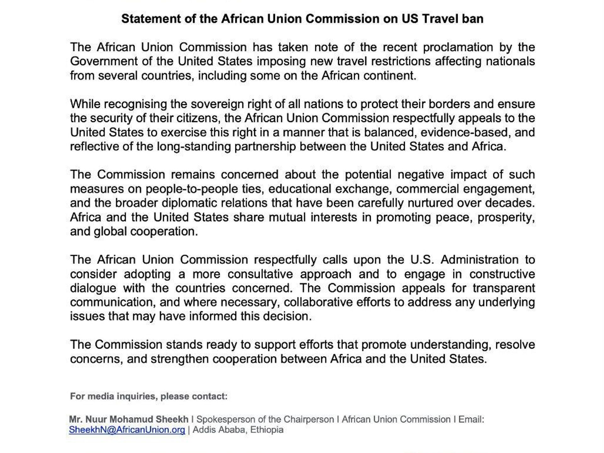 ኮሚሽኑ በትናንትናው ዕለት ባወጣው መግለጫ አሜሪካ ሉዓላዊ መብቷን ሚዛናዊ፣ ማስረጃ ላይ ተመስርታ እና በአሜሪካ እና በአፍሪካ መካከል ያለውን የረጅም ጊዜ አጋርነት በሚያንፀባርቅ መልኩ እንድትተገብር አሳስቧል።