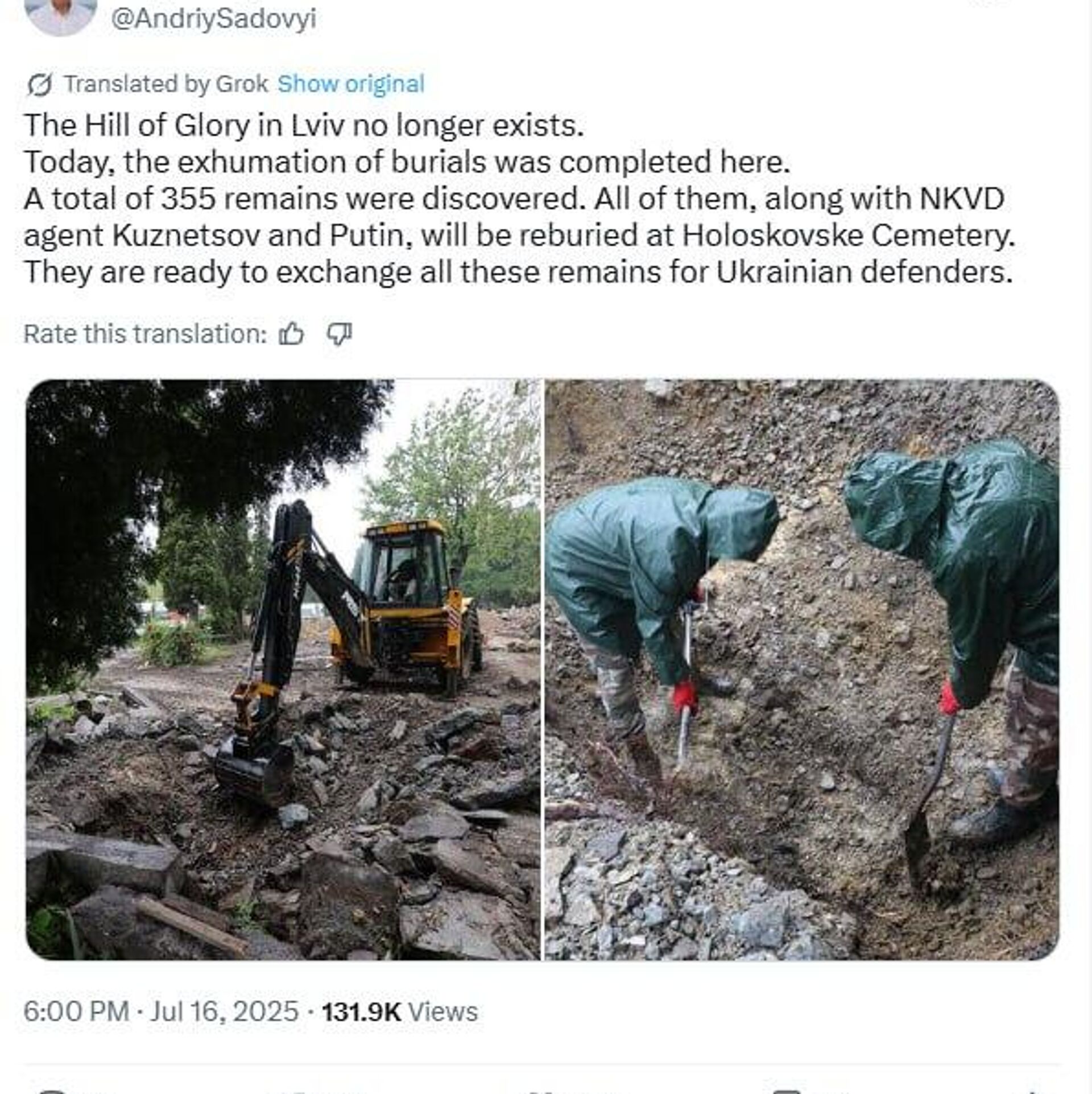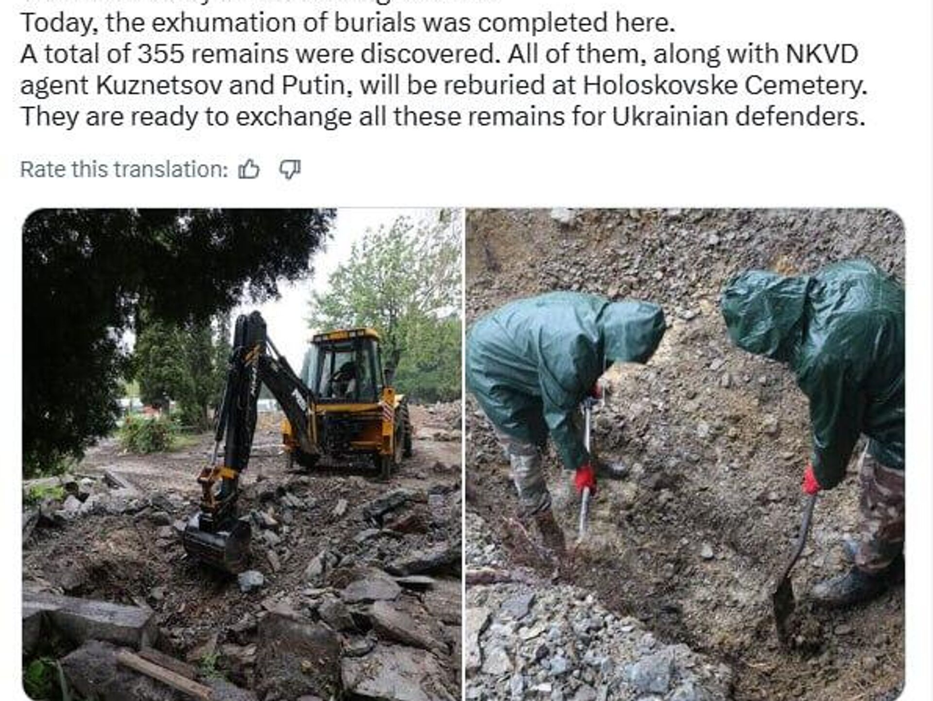 "355 የአስከሬን ቅሪቶች ተገኝተዋል፡፡ ሁሉም በጎሎስኮቭስኪ መቃብር ውስጥ እንደገና ይቀበራሉ። በእነዚህ ቅሪቶች የዩክሬን እስረኞችን ለመለዋወጥ ዝግጁ ነን" ሲሉ ከንቲባው በኤክስ አካውንታቸው ሃሳቡን አቅርበዋል።