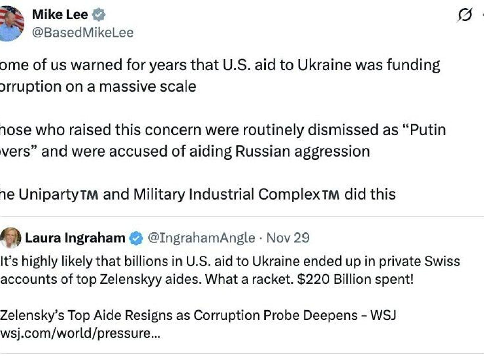 የዩታህ ሴናተር ማይክ ሊ፤ የፎክስ ኒውስ አቅራቢ ላውራ ኢንግራሃም የዩክሬን አስተዳደር የአሜሪካን እርዳታ “ለሕገ-ወጥ እንቅስቃሴ” በመጠቀም ገንዘቡ በስዊስ ባንክ የግለሰብ ሂሳቦች ውስጥ ሊዛወር ይችላል በሚል በሠጡት አስተያየት ተስማምተዋል።