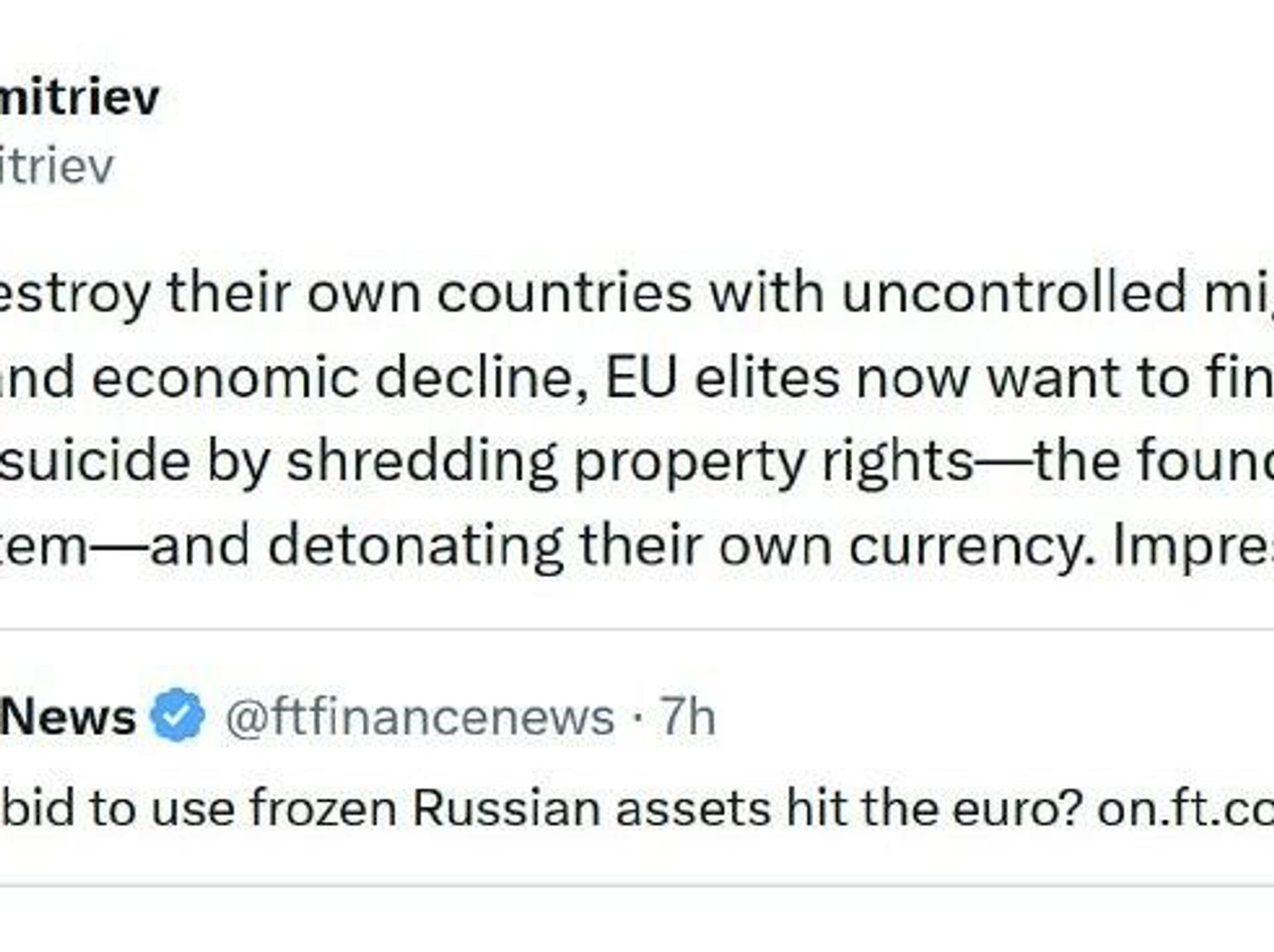 ዲሚትሪቭ አክለውም፣ የአውሮፓ ሕብረት የታገዱ የሩሲያ ሀብቶችን ለመውረስ ያለውን የቀጠለ ፍላጎት በመጥቀስ፣ አሁን “የፋይናንስ ሥርዓቱ መሠረት የሆነውን የንብረት ባለቤትነት መብትን በመሸርሸር እና የራሳቸውን ገንዘብ ዋጋ በማሳጣት ለአውሮፓ ለራሷ መዘዝ ማምጣት ” ይፈልጋሉ ብለዋል።