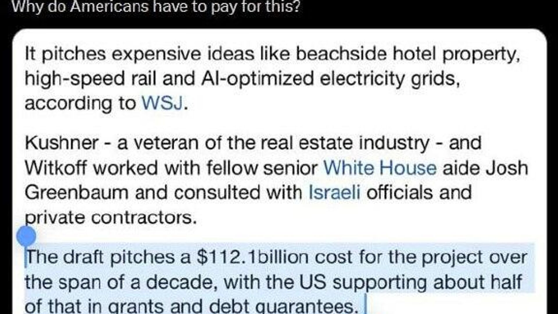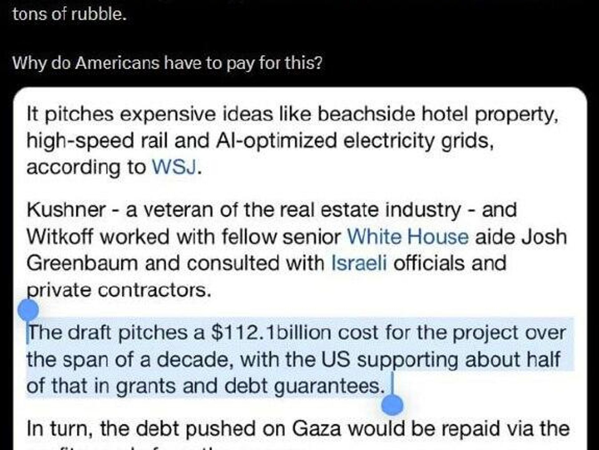 በሌላ በኩል የአሜሪካ የውጭ ጉዳይ ሚኒስቴር ለጋዛ መልሶ ግንባታ 60 ቢሊዮን ዶላር ለመመደብ እቅዷል መባሉን ውድቅ አድርጓል።