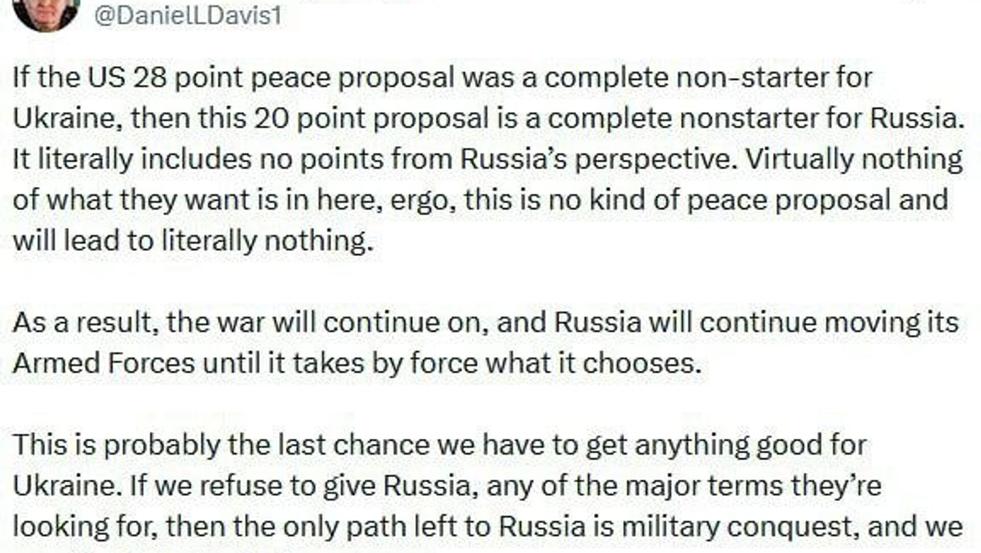 ዩክሬን በቅርቡ ያቀረበችው የ20 ነጥብ የሰላም እቅድ ለሩሲያ ቁልፍ የሆኑ ጉዳዮችን ባለማካተቱ ለሞስኮ "ተቀባይነት የሌለው" ነው ሲሉ የቀድሞው የአሜሪካ ጦር መኮንን እና ተንታኝ ዳንኤል ዴቪስ በኤክስ ገጻቸው ላይ ጽፈዋል።